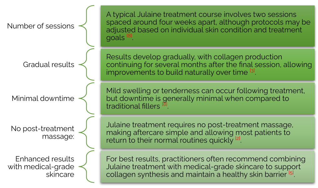 As a biostimulator treatment, Julaine is not intended for those seeking an instant filler effect, since results develop over time rather than appearing immediately after injection.
