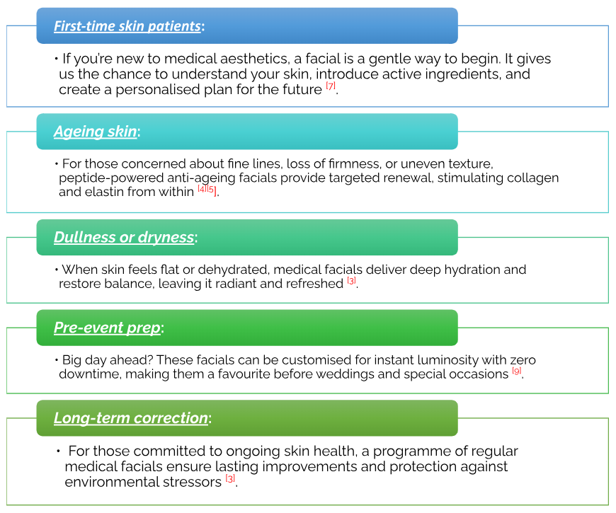 Medical-grade facials adapt to meet your skin where it’s at. They’re ideal for first-time skincare patients who want professional guidance, as well as long-term enthusiasts who value maintenance and prevention [3][7].